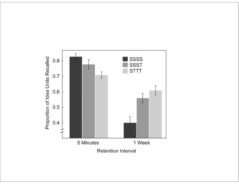 Building on the discoveries of German psychologist Hermann Ebbinghaus (1885), contemporaries Henry L. Roediger, III and Kathleen B. McDermott expand on the notion of spacing and interleaving’s efficacy in long term memory/retention [2]. In their study, participants were subjected to varying degrees of studying and testing before assessing their retention of material [2]. Studying a passage four times in one session without any testing of the material showed a higher short term retention rate than any combination of studying and testing. However, half of the participants took the assessment one week after the session where they had access to the material, and the opposite was true; participants who were tested more during the initial session showed higher long term retention than those who only studied the material several times [2]. This data is shown in the figure below from Roediger and McDermott [2]: